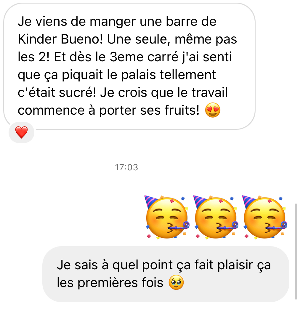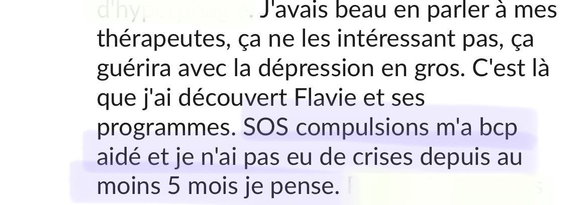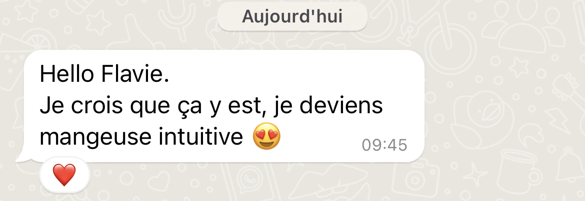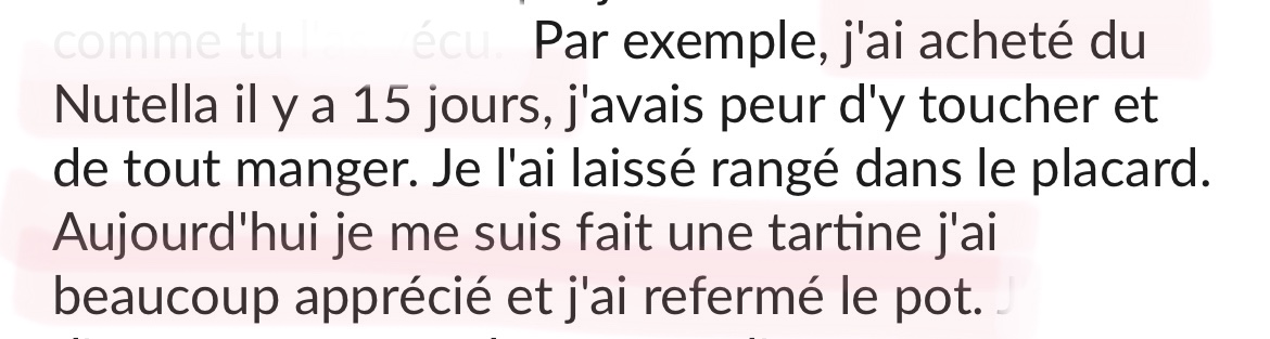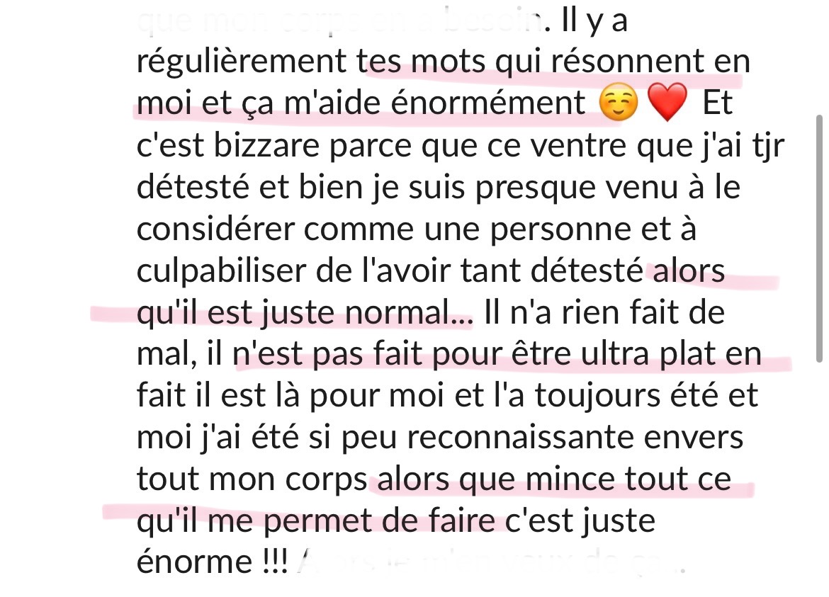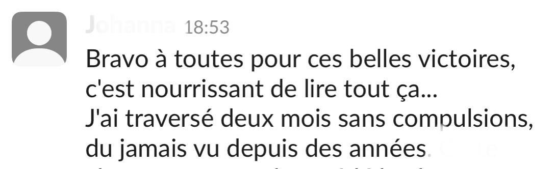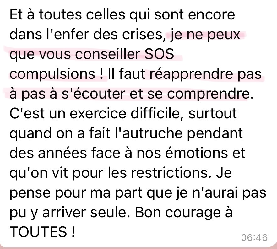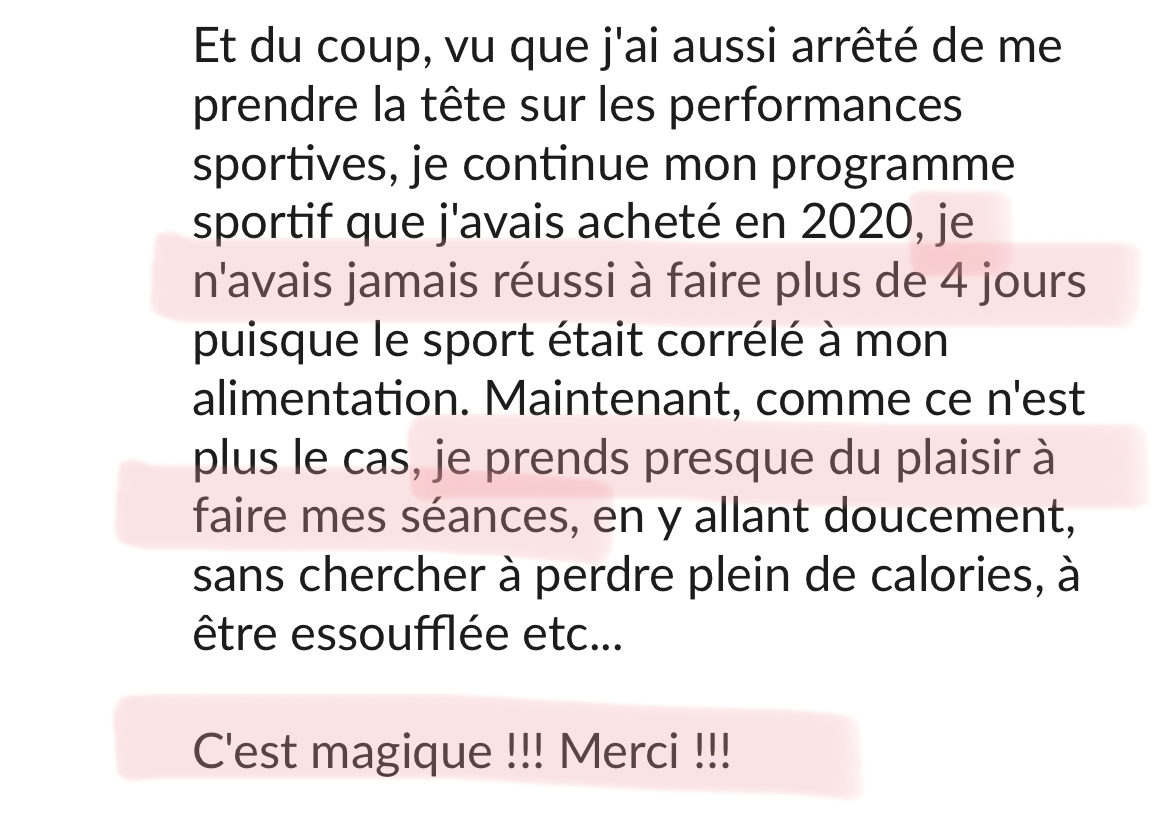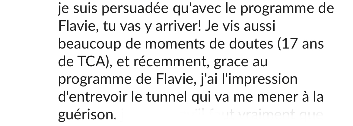 Merci beaucoup! Grâce à ton programme, grâce à ton compte Instagram, au groupe Slack et surtout grâce à ta bienveillance et ton empathie je vois le bout du tunnel! Après 20 ans de TCA, et l'impression que je serai malade toute ma vie, tu m'as donné de l'espoir, et mieux, tu m'as montré que ce n'était pas une fatalité, que guérir est possible!