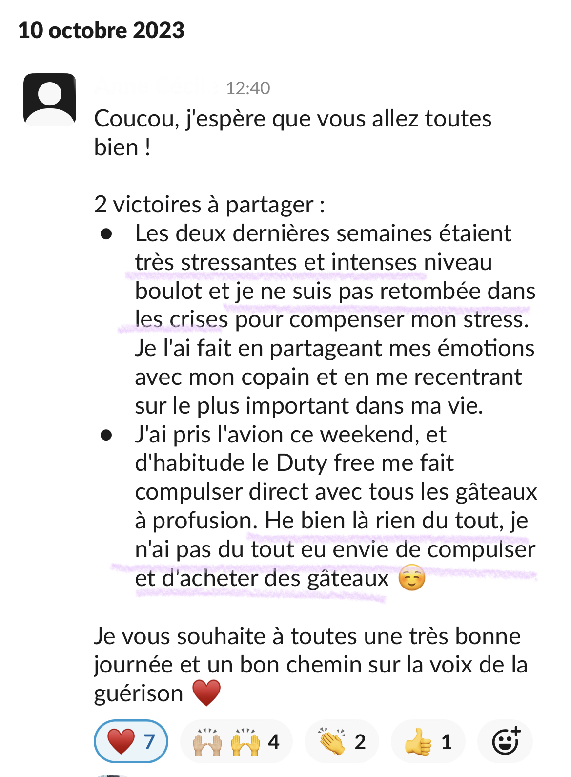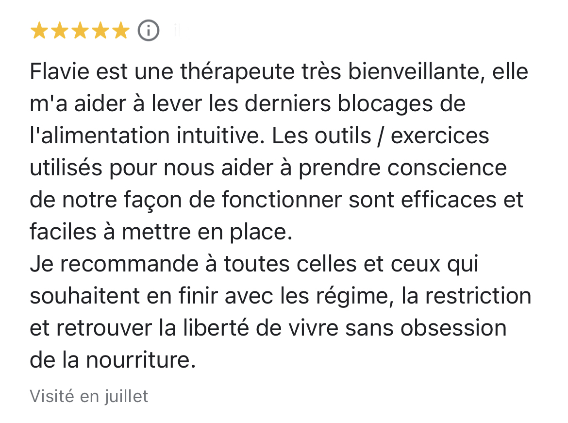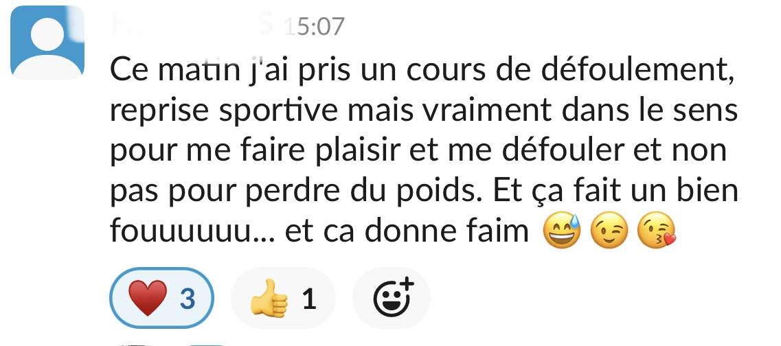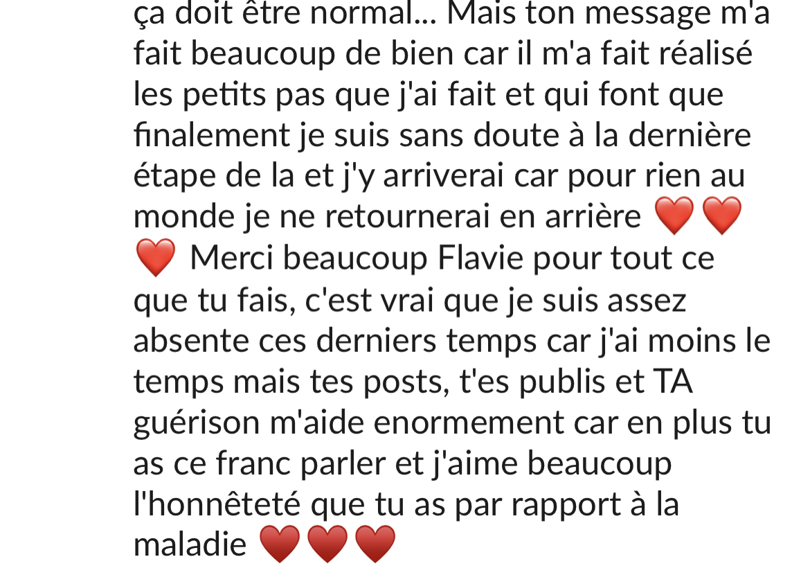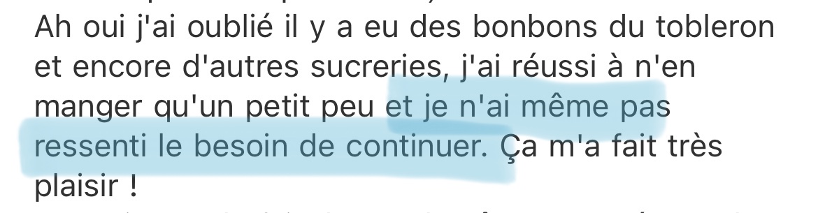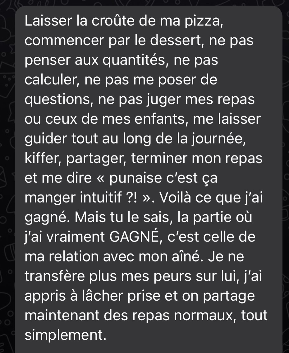 Merci beaucoup! Grâce à ton programme, grâce à ton compte Instagram, au groupe Slack et surtout grâce à ta bienveillance et ton empathie je vois le bout du tunnel! Après 20 ans de TCA, et l'impression que je serai malade toute ma vie, tu m'as donné de l'espoir, et mieux, tu m'as montré que ce n'était pas une fatalité, que guérir est possible!